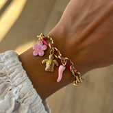 Bracelet ajustable en acier inoxydable. Charms plaqués or. Il est recommandé d'éviter tout contact avec l'eau et de sécher délicatement les charms après exposition à l'humidité.