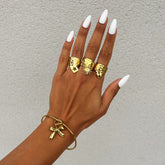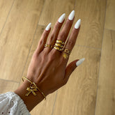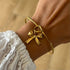 Jonc ajustable en acier inoxydable. Charms plaqués or. Il est recommandé d'éviter tout contact avec l'eau et de sécher délicatement les charms après exposition à l'humidité.