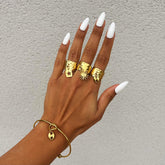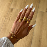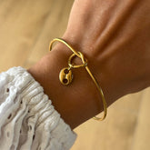 Jonc ajustable en acier inoxydable. Charms plaqués or. Il est recommandé d'éviter tout contact avec l'eau et de sécher délicatement les charms après exposition à l'humidité.