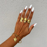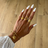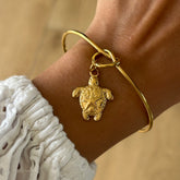 Jonc ajustable en acier inoxydable. Charms plaqués or. Il est recommandé d'éviter tout contact avec l'eau et de sécher délicatement les charms après exposition à l'humidité.